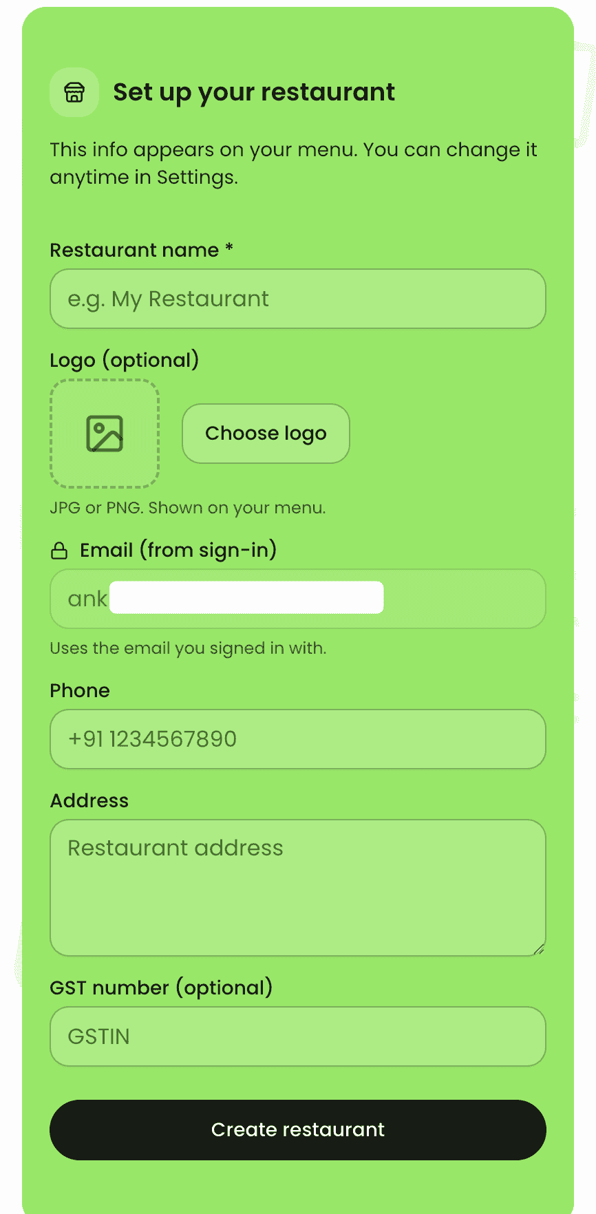 Sign up with email in 30 seconds. Add your restaurant name and logo—done.